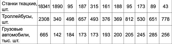 Об этом говорит многократное снижение выпуска важнейших видов машин и оборудования. Выпуск дизелей и дизельгенераторов снизился в 10,5 раза, металлорежущих станков в 15,5 раза, автоматических и полуавтоматических линий для металлообработки и машиностроения в 139 раз, что равнозначно отказу от такого рода оборудования. Производство ткацких станков снизилось с 18 341 тыс. штук в 1990 г. до 43 тыс. в 2008 г., т. е. в 426,5 раза. Это означает развал не только станкостроительной промышленности, но и тех отраслей, которых она обеспечивала необходимым оборудованием. Многократно снизился выпуск многих видов продукции, в том числе хлопчатобумажных, шерстяных и шелковых тканей.