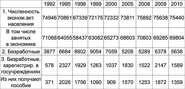 Рядовое население страны сразу же потеряло свои сбережения, а заработная плата основной части населения пошла вниз, приведя к снижению совокупного спроса, что, по Кейнсу, приводит к двум негативным последствиям: росту безработных и подрыву источников экономического роста. Так и произошло у нас. После того как новые собственники за бесценок приобрели значительные государственные активы, они стали увольнять значительную часть работников приватизированных предприятий как ненужных с точки зрения увеличения прибылей. Правомерное с капиталистической точки зрения действие привело к образованию не существовавшей ранее массовой безработицы значительной части трудоспособного населения. Приводимая ниже таблица дает об этом некоторое, хотя и далеко не полное, представление.