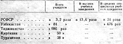 В этой таблице прежде всего бросается в глаза астрономическая цифра по Таджикистану. Это объясняется тем, что в 1914 г. на территории нынешнего Таджикистана насчитывалось всего 400 учащихся, а в 1956 г.- почти 362 тыс.