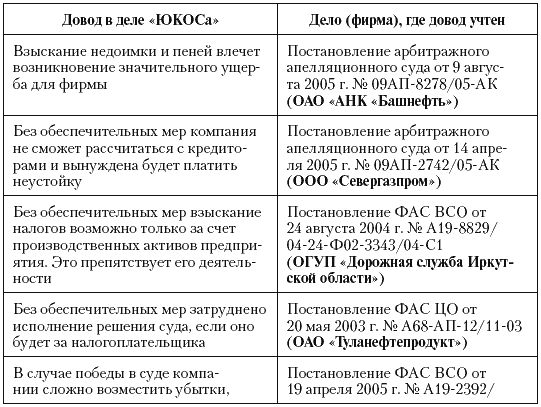 "ЮКОС" просил о применении обеспечительных мер – запрете на взыскание налогов. Ему не раз отказывали (пример – постановление ФАС МО от 10 июня 2005 г. № КА-А40/3222-05). Полагаем, дело здесь в ситуации, сложившейся вокруг нефтяников. Из-за нее суд не воспринимал обычно учитываемые факты. Мы привели их в табл. 26, считая, что на данные аргументы нужно ссылаться.