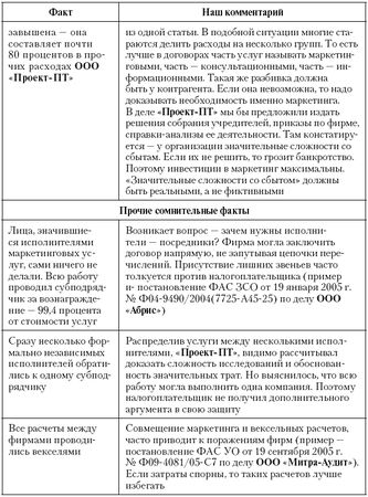 Предприятие оплатило услуги по изучению рынка алкоголя и узнало, что за некачественную работу маркетологов и консультантов отвечает налогоплательщик. Инспекторы и арбитры выявили недостатки в отчетах на услуги. К примеру, в них не было сведений о производителях, торгующих продукцией в регионе, где работает ООО "Проект-ПТ" (Красноярский край). Это снижает ценность исследований и заставляет предположить их фиктивность. Ведь информацию об известных участниках рынка легко найти в справочниках, Интернете и т. д. Здесь не нужно прилагать особых усилий, а данные о мелких компаниях – эксклюзив. Если он имеется, скорее всего проводилось реальное изучение рынка и тут проще доказать реальность затрат. Не стоит перегружать отчет общедоступной статистикой. Площадь территории, занятость, обеспеченность населения жильем – похоже, что все это контрагенты или само общество собирали для солидности, чтобы отчет показался толще. Но арбитраж количество бумаг не убедило. Нет "конкретных показателей состояния алкогольного рынка (информации о местной и ввозимой продукции, потреблении спиртного)", – отметили судьи, усомнившись в реальности услуг. Еще им не понравилось наличие информации по России, хотя отсутствуют региональные данные. В отчете, как работающие, упоминались уже недействующие производители. Это тоже пусть косвенное, но доказательство использования устаревших публикаций. Просуммировав имеющиеся подозрения (некоторые из них даны в табл. 29) арбитраж установил фиктивность услуг и необоснованность снижения прибыли.