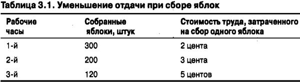 Закон уменьшения отдачи иногда называют "принципом низко висящих фруктов". Представим, что мы собираем яблоки в яблоневом саду. В течение первого часа работы будет собрано множество яблок, поскольку мы будем собирать низко висящие плоды, которые легко достать. В течение второго часа мы не сможем собрать так много, потому что придется доставать те фрукты, которые висят более высоко и поэтому их неудобно собирать. В течение третьего часа работы будет собрано еще меньше яблок; теперь приходится каждый раз подпрыгивать для того, чтобы дотянуться до яблока, потому что оставшиеся на деревьях яблоки висят очень высоко. Табл. 3.1 демонстрирует, как уменьшается производительность - объем продукции при данных затратах - с каждым дополнительным часом работы.