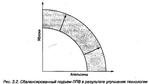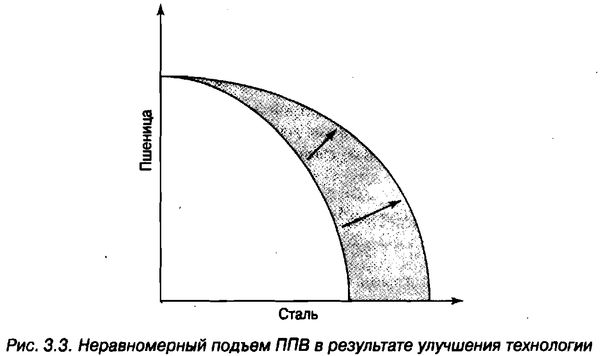 Но технологические инновации в большинстве своем распределены неравномерно. Предположим, что вы рассматриваете ППВ, где двумя видами произведенных товаров являются сталь и пшеница. Усовершенствование процесса изготовления стали обязательно позволит вам выработать больше стали из ваших ограниченных ресурсов, но никак не отразится на выращивании пшеницы.
