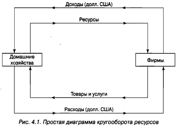 При рассмотрении ВВП вам также нужно учесть все товары и услуги, которые обмениваются на деньги. Экономисты упрощают жизненные реалии, заявляя, что все ресурсы или факторы производства общества - земля, труд и капитал (см. главу 3) - принадлежат домашним хозяйствам. Домашние хозяйства могут вестись как одним человеком, так и несколькими - например, индивидуумами или семьями. Фирмы покупают или арендуют средства производства у домашних хозяйств и используют их для производства товаров и услуг, которые затем снова продают домашним хозяйствам. Этот процесс устанавливает кругооборот ресурсов, которые переходят от домашних хозяйств к фирмам, а товары и услуги движутся назад другим путем, как показано на рис. 4.1.