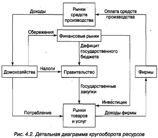 Простая диаграмма кругооборота ресурсов на рис. 4.1 показывает, что доход существует для всякого расхода. Тем не менее, поскольку диаграмма разделяет всю экономику только на фирмы и домохозяйства, в ней отсутствует масса действий, которые происходят в реальном мире. На рис. 4.2 вы можете увидеть намного более реалистичную и детальную диаграмму кругооборота, которая делит экономику на фирмы, домохозяйства и правительство, которые действуют на трех названных ниже рынках.