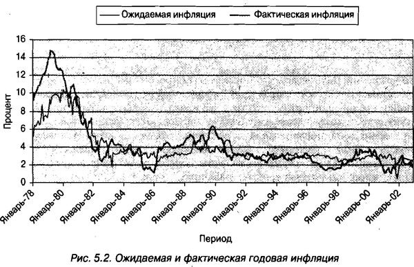 Схема, изображенная на рис. 5.2, отражает фактический темп инфляции вместе с ожидаемым средним темпом инфляции. Фактические темпы инфляции получены на основе ежемесячных показателей ИПЦ, а ожидаемые темпы получены в результате опроса потребителей, проводимого каждый месяц специалистами Мичиганского университета. Вы может видеть, что фактическая инфляция между январем 1980 года и январем 1981 года составляла около 13%. Потребители, которых опрашивали в январе 1980 года по поводу их инфляционных ожиданий на ближайшие 12 месяцев, сказали исследователям, что они ожидают рост цен примерно на 10% за год. В этом отдельном примере фактическая инфляция превысила ожидаемую обычными потребителями примерно на 3%.