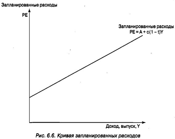 Переменная А означает автономные расходы, под которыми экономисты понимают часть запланированных расходов, которые не зависят от доходов (Y). Часть запланированных расходов, которые зависят от доходов, c(1 - t)Y, известна как индуцированные расходы.