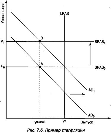 Ситуация, показанная на рис. 7.6, может быть названа стагфляцией; под этим термином экономисты подразумевают, что экономика одновременно переживает застой производства и инфляцию.