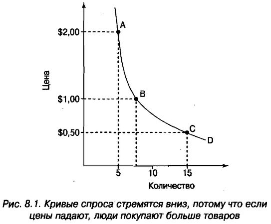 Например, если кто-то не любит капусту, вы не увидите его среди тех, кто покупает пять кочанов по цене 2 долл., как это происходит в точке А на рис. 8.1. Если люди не любят капусту, они будут покупать ноль кочанов, невзирая на цену, и кривая их спроса будет выглядеть совершенно иначе.