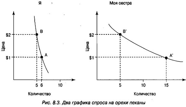 Для того чтобы сделать это обсуждение более конкретным, давайте рассмотрим рис. 8.3, где на двух отдельных графиках начерчены две отдельные кривые спроса. На графике, расположенном слева, отражен мой спрос на орехи пеканы. На графике, расположенном справа, отражен спрос на пеканы моей сестры.