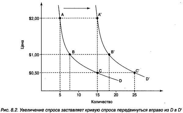 Предположим, что по данным исследования здоровья граждан стало известно, что капуста делает людей по-настоящему привлекательными для противоположного пола. Естественно, эта информация будет способствовать увеличению спроса на этот овощ. На графике это влияние передвинет кривую спроса вправо. Этот эффект проиллюстрирован на рис. 8.2, где кривая спроса до обнародования результатов исследования обозначена буквой D, а кривая спроса на капусту, возникшего после распространения данной информации, - D'.