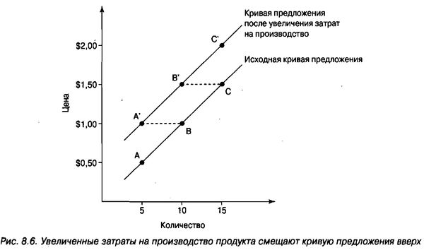 Поскольку структура затрат поставщика определяет местоположение кривой предложения и угол ее наклона, изменения в структуре затрат приводят к смещению кривой предложения. На рис. 8.6 затраты мистера Бэбиджа на производство увеличиваются, поскольку правительство навязало новые ограничения на употребление удобрений, по которым капусту нужно выращивать без использования пестицидов. Это значит, что мистеру Бэбиджу нужно нанять больше рабочих, чтобы они с помощью щипчиков помогли ему избавиться от капустных паразитов, вместо того чтобы воспользоваться дешевыми, но запрещенными химикатами.