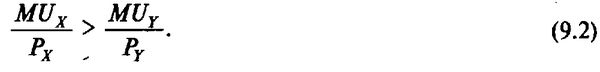 Но этот способ расходования средств не является оптимальным. Причиной этого является тот факт, что на деньги, которые я трачу на текущий последний кусочек X (пиццы), можно купить больше предельной полезности, чем на деньги, которые я трачу на последний кусочек Y (пиво). Если я могу получить больше полезности, потратив доллар на X, чем когда потрачу его на Y, я должен изъять деньги из предназначенных для Y с тем, чтобы потратить их на X. И до тех пор, пока неравенство (9.2) будет справедливым, я буду продолжать изымать деньги от предназначенных для приобретения Y для того, чтобы увеличить траты на X.