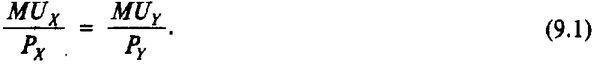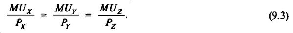 Также нужно понять, что уравнение (9.1) может быть использовано для многих товаров. Например, в случае с тремя разными товарами вам нужно организовать свои закупки таким образом, чтобы последняя единица каждого вида товара X, Y и Z приносила одинаковую полезность на доллар: