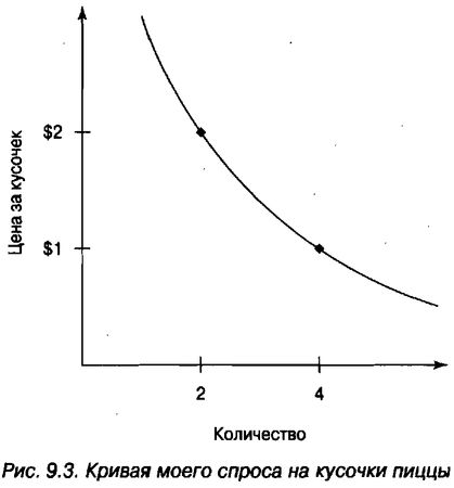 Я могу использовать информацию о том, как величина моего спроса изменяется при повышении цены на пиццу, для того, чтобы разместить две точки на кривой моего спроса: четыре кусочка при цене 1 долл. и два кусочка при цене 2 долл. На рис. 9.3 я отметил эти две точки и начертил примерную кривую спроса. Когда вы будете рассматривать рисунок, помните о двух вещах.