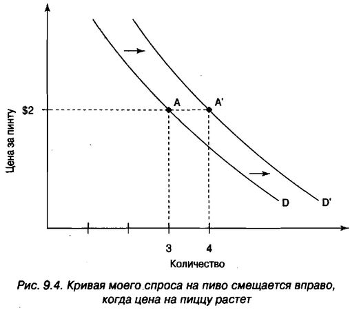 Давайте проанализируем, как увеличение цены на пиццу повлияет на кривую спроса на пиво. Величина моего спроса на пиво возросла от трех пинт до четырех, когда цена на пиццу увеличилась от 1 долл. до 2. Но цена на пиво осталась неизменной. Это значит, что кривая спроса на пиво должна оказаться смещенной (что я объясняю в главе 8).
