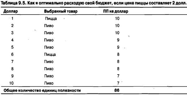 Как можно ожидать, более высокая цена на пиццу приведет меня к тому, что я буду есть меньше пиццы и пить больше пива. Вы можете убедиться в этом, потратив с этой целью каждый из моих долларов таким образом, что я приобрету тот товар, который имеет более высокую предельную полезность. (Раздел "Распределение денег между двумя видами товара для максимизации совокупной полезности", ранее в этой главе, знакомит вас с этим процессом.) Результаты этих действий показаны в табл. 9.5.