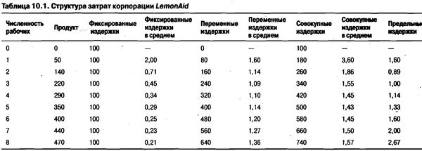 Причина, по которой экономисты устанавливают разницу между фиксированными и переменными издержками предприятия, состоит в том, что они оказывают слишком разное влияние на принятие решений в отношении количества производимого товара. Давайте посмотрим на табл. 10.1, в которой приведены данные о структуре затрат корпорации LemonAid, нашего производителя лимонада.