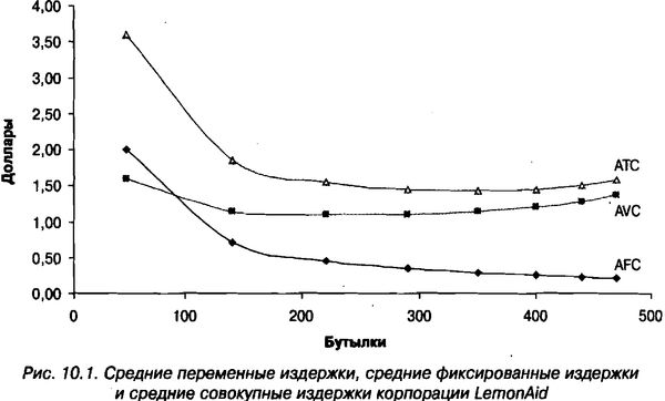 График средних переменных издержек корпорации LemonAid изображен на рис. 10.1. (Там же показаны средние фиксированные издержки и средние совокупные издержки компании.) Запомните эту кривую средних переменных издержек, поскольку она будет иметь огромное влияние на то, сколько бутылок захотят произвести менеджеры фирмы с тем, чтобы максимизировать прибыль своей фирмы.