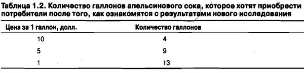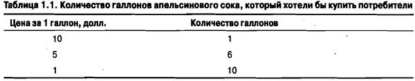 Предположим, что экономисты вышли на улицу и провели опрос потребителей, спрашивая их, сколько галлонов (галлон = 4,54 л. - Примеч. пер.) апельсинового сока они купили бы по трем гипотетическим ценам: 10 долл. за галлон, 5 долл. за галлон и 1 долл. за галлон. Результаты этого опроса можно увидеть в табл. 1.1.