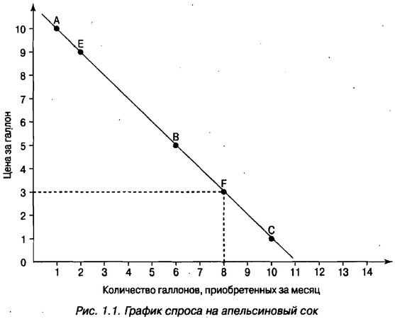 Точка А - визуальное изображение данных, находящихся в первой строке табл. 1.1. Она говорит о том, что по цене 10 долл. за галлон апельсинового сока люди хотя приобрести только 1 галлон в месяц. Подобным же образом точка В сообщает, что в месяц людям нужно 6 галлонов сока по цене 5 долл., а точка С свидетельствует: по цене 1 долл. за галлон потребители будут приобретать по 10 галлонов сока в месяц.