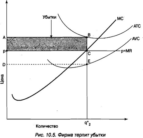 Чтобы рассмотреть другую ситуацию, вернемся к рис. 10.5. В этом случае фирма более чем покрывает свои переменные издержки, поскольку совокупный доход (представленный прямоугольником, его четыре угла расположены в начале координат и точках Р, С и q*2) превышает переменные издержки (представленные прямоугольником, его четыре yrrta расположены в начале координат и точках D, Е и q*2). Хотя эта фирма теряет деньги, ей все же лучше производить q*2, чем q = 0, поскольку совокупный доход превышает переменные издержки. Она может использовать деньги, оставшиеся после покрытия переменных издержек, для оплаты части фиксированных расходов.