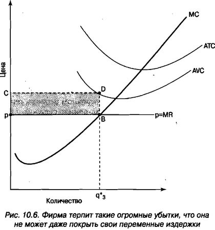 Рассмотрим рис. 10.6, где цена, по которой фирма может продать свой продукт, настолько низкая, что линия предельного дохода (р = MR) и кривая предельных издержек (МС) пересекаются в точке, находящейся ниже кривой средних переменных издержек (АVС). Что это значит? Попросту говоря, совокупный доход в этом случае в действительности ниже уровня переменных издержек. (Совокупный доход представлен прямоугольником, его четыре угла находятся в начале координат, точках р, В и q*3, где q*3 представляет оптимальный уровень продукта при этой цене. Переменные издержки представлены прямоугольником, чьи четыре угла расположены в начале координат, точках С, D и q*3.)