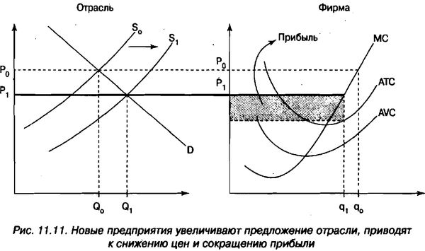 На рис. 11.11 показано, что происходит, когда в отрасли появляются новые предприятия. Их вновь выпущенная продукция увеличивает общее производство таким образом, что кривая совокупного предложения смещается от S0 до S1 на графике, расположенном слева. Это снижает рыночную равновесную цену от Р0 до P1.