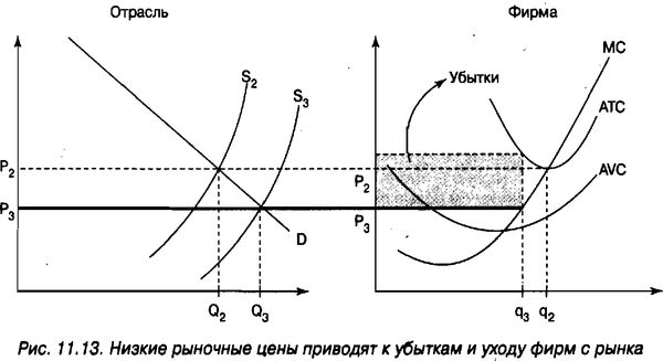 Похожий механизм обратной связи приводит к получению нулевой прибыли и эффективному производству, если отрасль начинает терпеть убытки. Для того чтобы понять этот процесс, давайте посмотрим на рис. 11.13, где кривая изначального предложения, S3, взаимодействует с кривой спроса, D, от чего возникает очень низкая рыночная цена, P3.