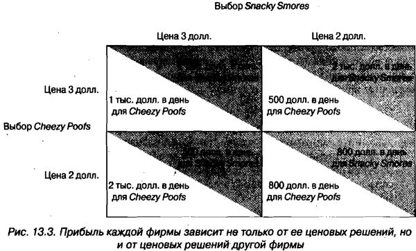 Рис. 13.3 показывает платежную матрицу для обеих фирм, в зависимости от выбора каждой назначаемой цены. Размер платежа подан в единицах ежедневной прибыли каждой из фирм, причем прибыль Snacky Smores подана в заштрихованных треугольниках.