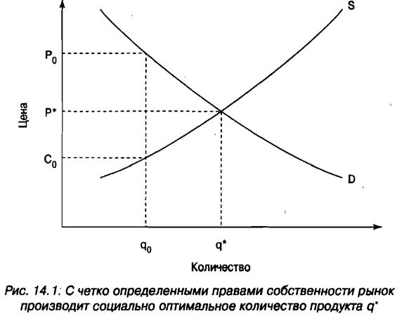 А сейчас я постараюсь доказать, что такой хороший результат достигается только тогда, когда права собственности определены целиком и полностью, что значит - кривая спроса вбирает в себя все выгоды, за которые люди готовы платить, а кривая предложения охватывает все издержки, связанные с производством. Как вы сами сможете убедиться, если права собственности должным образом не определены, рынок не сможет производить продукт на социально оптимальном уровне подобно q*. В таких случаях предполагаемая невидимая рука превращается в действительно невидимую - поскольку ее в самом деле нет!