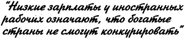 Люди, которые обращают внимание исключительно на разницу в стоимости труда в пересчете на часы, никогда не упоминают разницу в продуктивности, которая обычно отражает стоимость труда в пересчете на единицу произведенного продукта. И не думайте, что в своем примере я использовал подтасованные цифры. Разница в заработной плате в разных странах действительно имеет тенденцию отражать разницу в производительности.