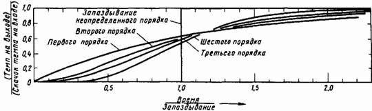 На рис. 8–8 показан выход из запаздываний первого, второго, третьего, шестого и неопределенного порядков при скачкообразном характере изменения темпа ввода; в этом случае в нулевой момент времени задается величина темпа внезапно возникшего потока на входе. По оси ординат на этом рисунке отложено отношение темпа потока на выходе из запаздывания к темпу на входе.