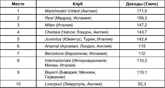 Список европейских футбольных клубов по доходам возглавляют английский Manchester United ("Манчестер юнайтед"), испанский Real ("Реал"; Мадрид) и итальянский Milan ("Милан") (табл. 19).