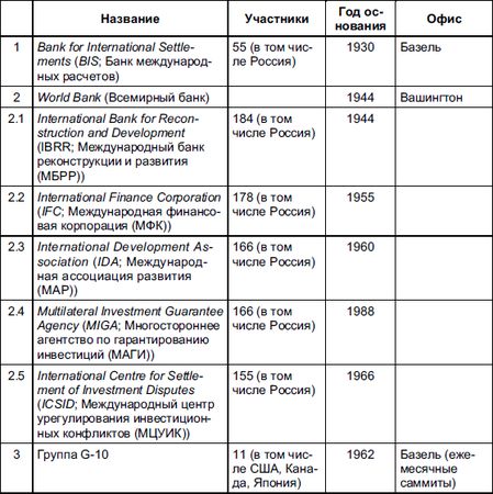 Крупнейшими международными кредитно-валютными организациями являются: Международный валютный фонд, Всемирный банк, Европейский банк реконструкции и развития, Европейский инвестиционный банк, Банк международных расчетов, Азиатский банк развития, Африканский банк развития, Межамериканский банк развития. Краткие сведения о некоторых из данных организаций см. в табл. 21.