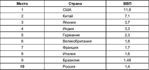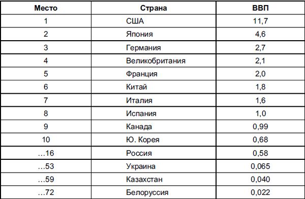 Таблица 11. Страны-лидеры по объему ВВП (в трлн $, на конец 2004 г.) [15]