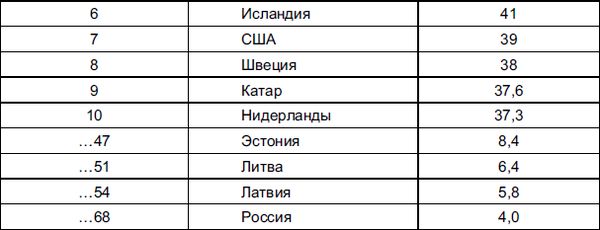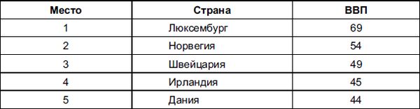 Таблица 12. Страны-лидеры по объему ВВП на душу населения (в тыс. $, на конец 2004 г.)