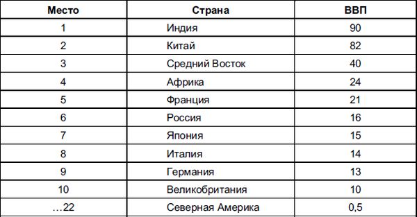 Таблица 14. Страны-лидеры по объему ВВП в пересчете на покупательную способность (в млрд международных $, [17] по состоянию на 1700 г.) [18]
