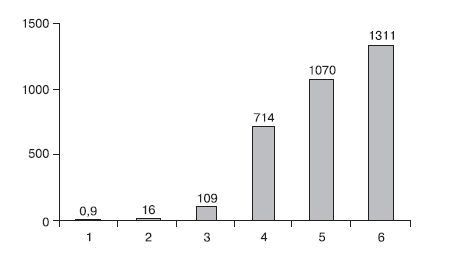 Рис. 41. Перевозки грузов по видам транспорта общего пользования в 2006 г. [70] (млн т) Обозначения на рисунке: 1 – авиация; 2 – морской транспорт; 3 – внутренний водный; 4– автомобильный; 5 – трубопроводный; 6 – железнодорожный