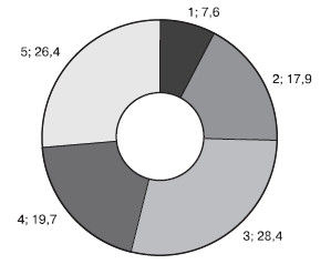 Рис. 2. Распределение на население по величине среднедушевых денежных доходов в 2006 г. (%) [7] Обозначение на рисунке: 1 – население с доходами до 2500 руб. в месяц; 2 – население с доходами в интервале от 2500 до 4500 руб.; 3 – от 4500 до 8 тыс. руб.; 4 – от 8 тыс. до 12 тыс. руб.; 5 – свыше 12 тыс. руб.