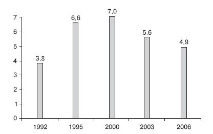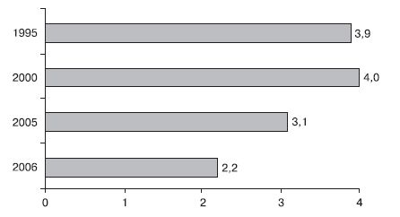 Пик количества безработных в РФ был достигнут в 2000 г., с этого времени численность не имеющих работы россиян постепенно сокращается (рис. 4).