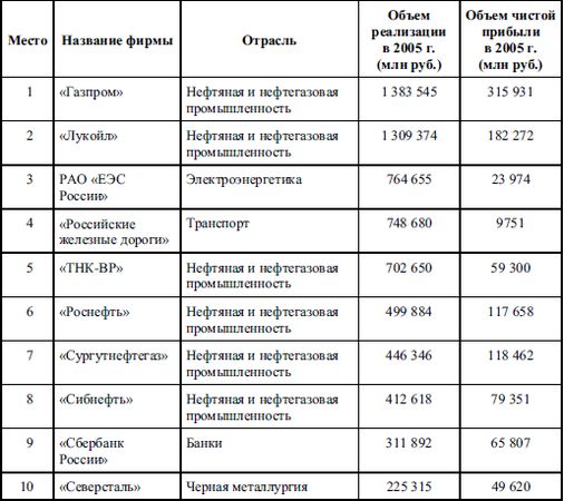 Значительная часть крупнейших российских предприятий действует в сфере нефтяной и нефтегазовой промышленности (табл. 1).