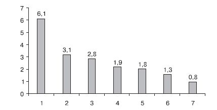 Рис. 82. Объем ВРП в 2005 г. в федеральных округах РФ (трлн руб.) Обозначения на рисунке: 1 – Центральный федеральный округ; 2 – Уральский; 3 – Приволжский; 4 – Сибирский; 5 – Северо-Западный; 6 – Южный; 7 – Дальневосточный