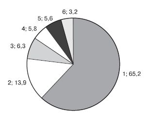 Обозначения на рисунке: 1 – топливно-энергетические товары; 2 – металлы и изделия из них; 3 – другие товары; 4 – машины, оборудование и транспортные средства; 5 – продукция химической промышленности; 6 – древесина и целлюлозно-бумажные изделия