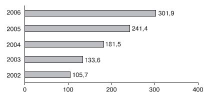 Таблицы 20 и 21 свидетельствуют, что основными экспортными товарами РФ являются сырьевые ресурсы; импорт же нашей страны в основном представляет собой продукцию машиностроительной отрасли. Изменение объема российского экспорта за последние 5 лет представлено на рис. 96.