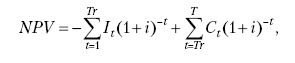 где I t – денежный поток первоначальных инвестиций; C t – денежный поток от реализации инвестиций в момент времени t; t - шаг расчета (год, квартал, месяц и т. д.); i - ставка дисконтирования.