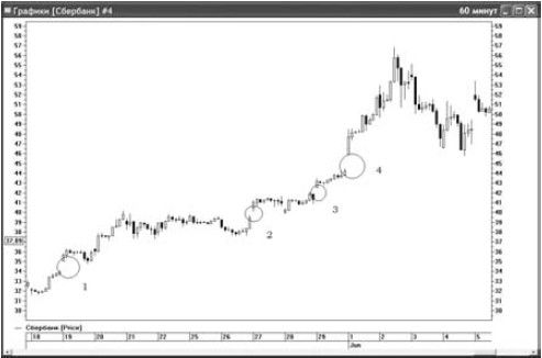 Рис. 4.1. В период ралли Сбербанка существенная часть движения происходила во время гэпов. Скальперы, которые не оставляют позиций в овернайт, лишают себя возможности получить прибыль от утренних скачков цены