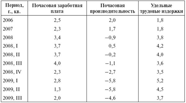 Темпы прироста почасовой заработной платы, производительности и удельных трудовых издержек, % (в годовом исчислении)