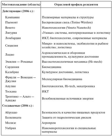 К настоящему времени в Италии насчитывается более 20 действующих и создаваемых ТО и НТП разной величины (табл. 8.6). Отраслевая специализация ТО, как можно видеть, охватывает широкий спектр современных передовых технологий – от аэрокосмических до технологий охраны окружающей среды. Стоит отметить, что многие ТО и НТП созданы или программируются в экономически менее развитой южной части страны: таковы кластеры в Апулии, Калабрии, Базиликате, Абруццо, Молизе, на островах Сицилия и Сардиния.