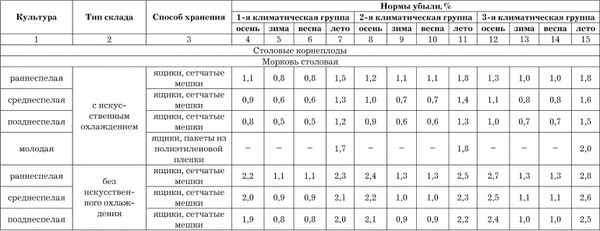 Нормы естественной убыли массы столовых корнеплодов, картофеля, плодовых и зеленных овощных культур разных сроков созревания при хранении